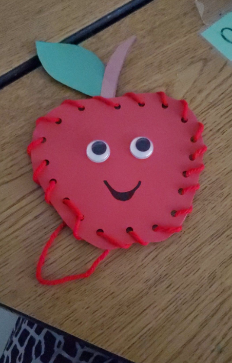 Honestly, lacing cards are a quiet but super fun activity for toddlers. I cut apple shapes out of cardboard and punch holes around the edge for lacing. I’ve found toddlers really enjoy threading yarn through the holes—it’s like magic for their little fingers.