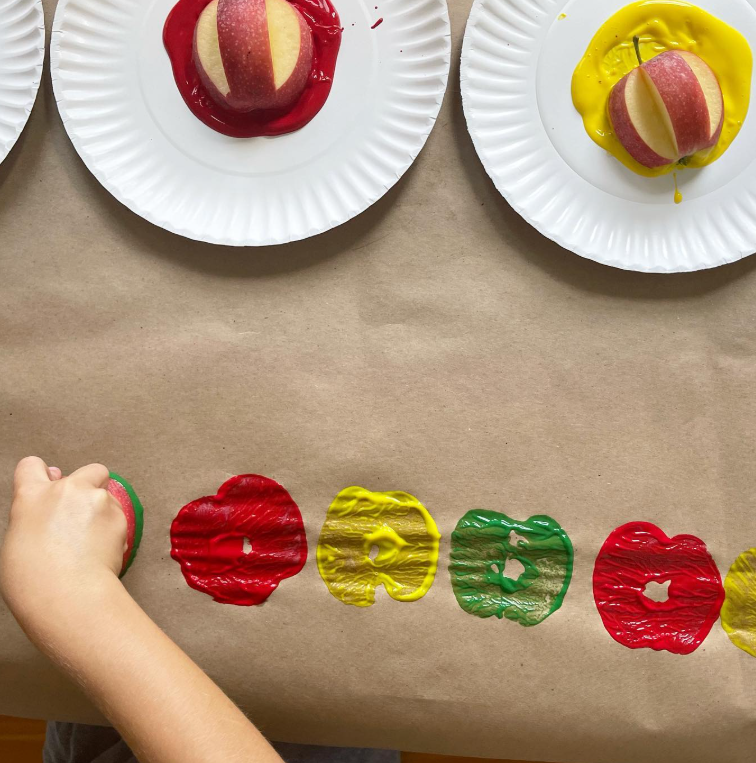 Playdough apples are honestly one of the easiest ways to combine art and sensory play. I just give toddlers red, green, and yellow playdough and let them shape apples. I’ve found some try rolling tiny apple slices, which honestly cracks me up every time.