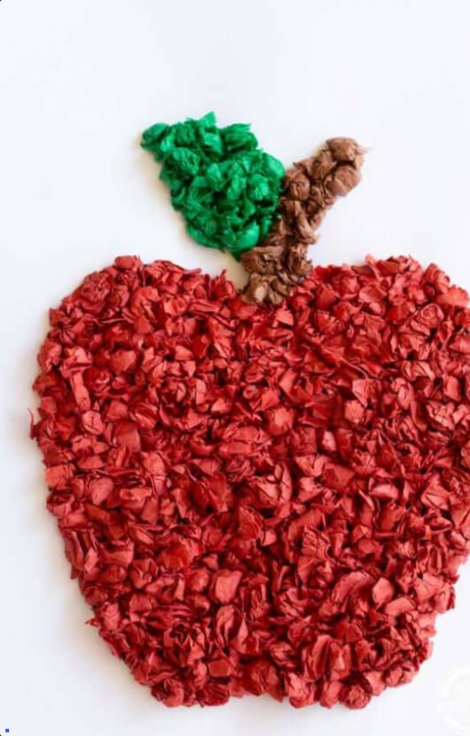 Tissue paper apples are honestly a favorite in my house when I want something a little less messy than paint but still colorful. I tear small squares of red, green, and sometimes yellow tissue paper, and the kids stick them onto a drawn apple outline using glue. I’ve found that toddlers love the texture, and honestly, their little fingers get so sticky that it adds another layer of fun.
