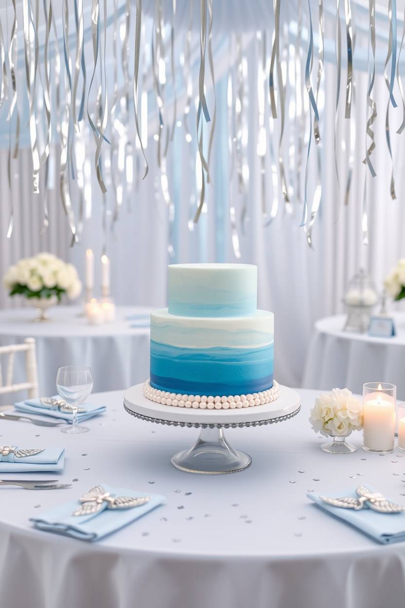 I found these amazing silver angel wing napkin rings online, and they completely pulled the look together. The cake had tiny edible pearls and soft blue ombré icing. It was elegant without trying too hard. To be honest, I didn’t want to take it down afterward—it was just so serene.