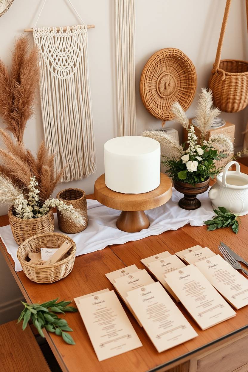 We used kraft paper menus and had little wildflower seed packets as favors. In my opinion, those small touches make the biggest impact. And can we talk about how perfect a wooden cake stand is for this theme? Everything looked straight out of a boho Pinterest board, but real life—and way more fun.