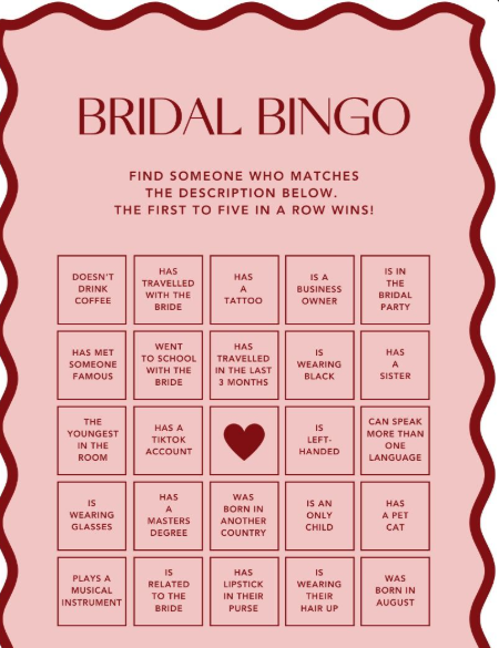 This game is such a clever icebreaker. Instead of gifts, the bingo squares have descriptions like “someone who traveled abroad” or “someone who knows the bride from school.” Guests have to find people who match each description.