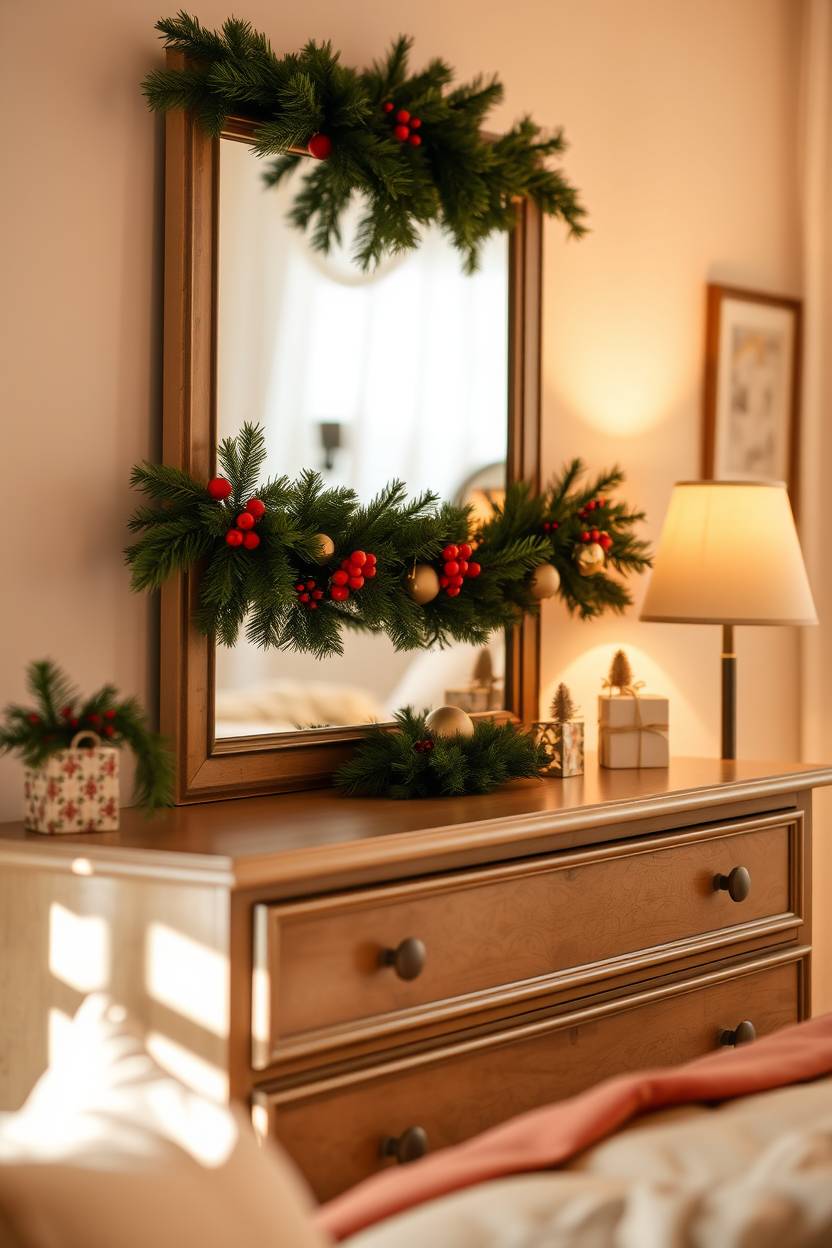 I have a mirror above my dresser that I wasn’t doing much with—until I draped some faux pine garland over it. Instant upgrade. It frames the mirror so nicely and adds that natural wintery touch without bringing in actual pine needles (which, let’s be real, are a pain).