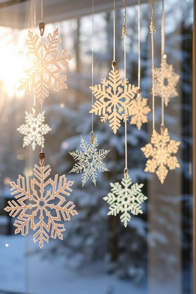 Okay, I’m a sucker for anything that looks like it came from a snow globe. Hanging snowflakes? Yes, please. I use clear fishing wire and dangle different-sized paper and acrylic snowflakes across the top of my window frame. When the sunlight hits them in the morning—magic.