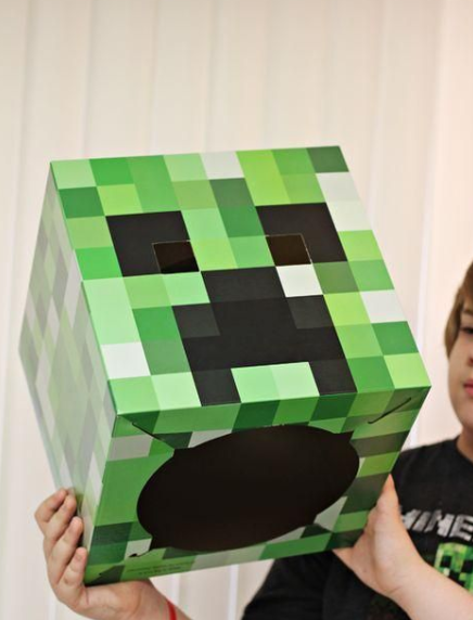 I usually use a box shape again and cover it with skin-tone paper, then add the pixel face details. Cutting out eye holes is important, of course. I’ve seen kids instantly get into character once they wear it—it’s honestly hilarious and kind of adorable at the same time.