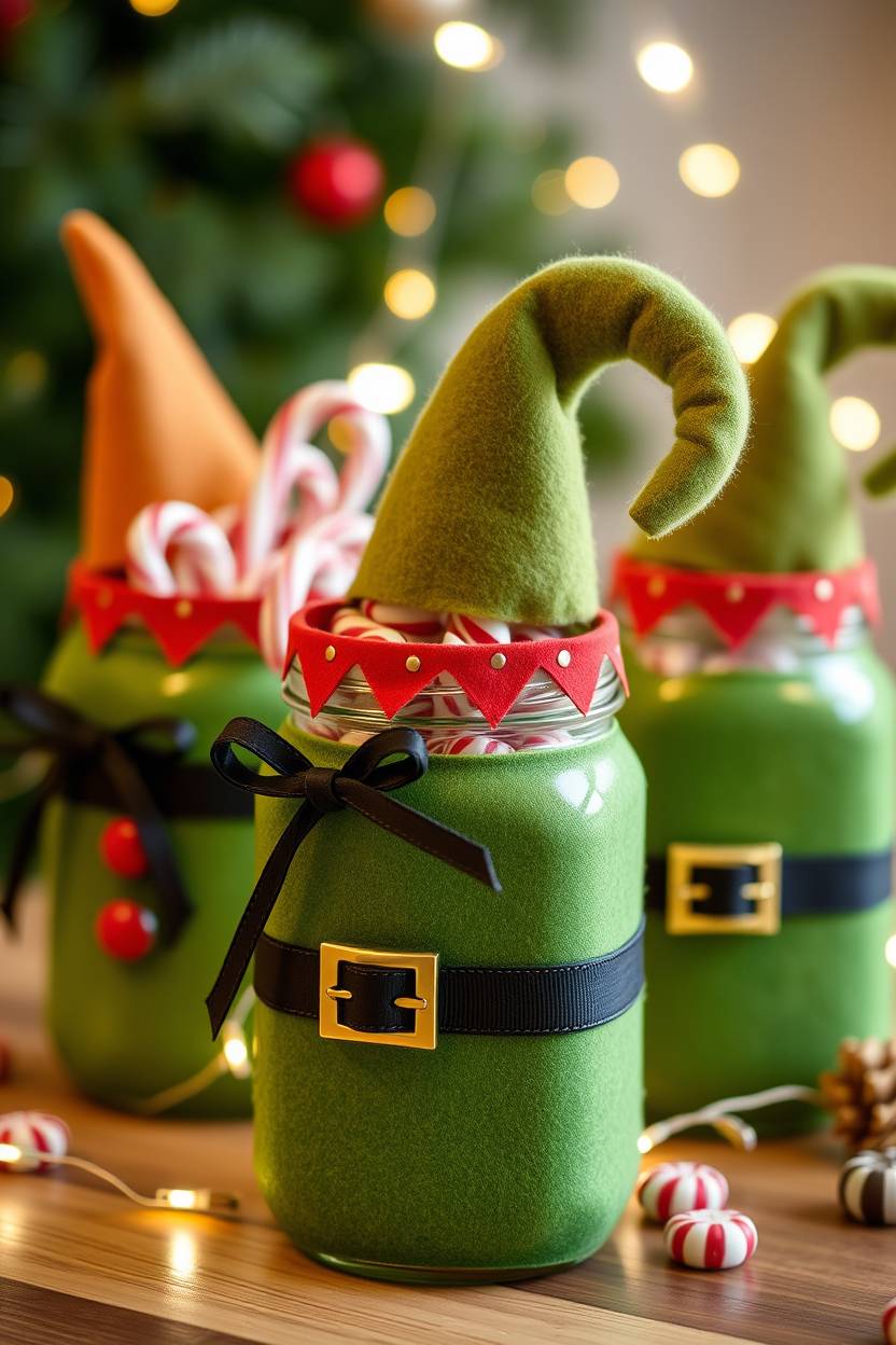 I’ve always loved mason jar crafts, and turning them into elf-themed jars is such a cute idea. I wrap the jars in green felt, add a red felt collar around the top, and glue on a belt made of black ribbon with a gold buckle. Fill them with candy canes, chocolates, or even hot cocoa mix, and suddenly you’ve got the perfect little gift.