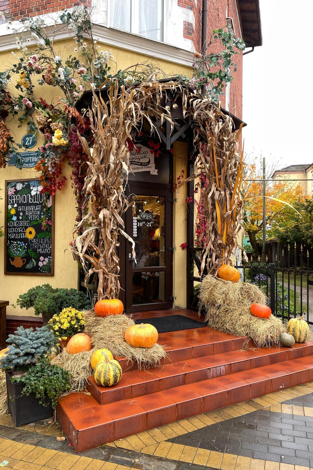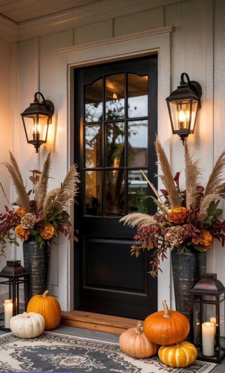 Use vertical space with hanging wreaths or wall signs, and keep the decor minimal. A small doormat, a few pumpkins, and a potted mum or lantern can make a big impact without cluttering.