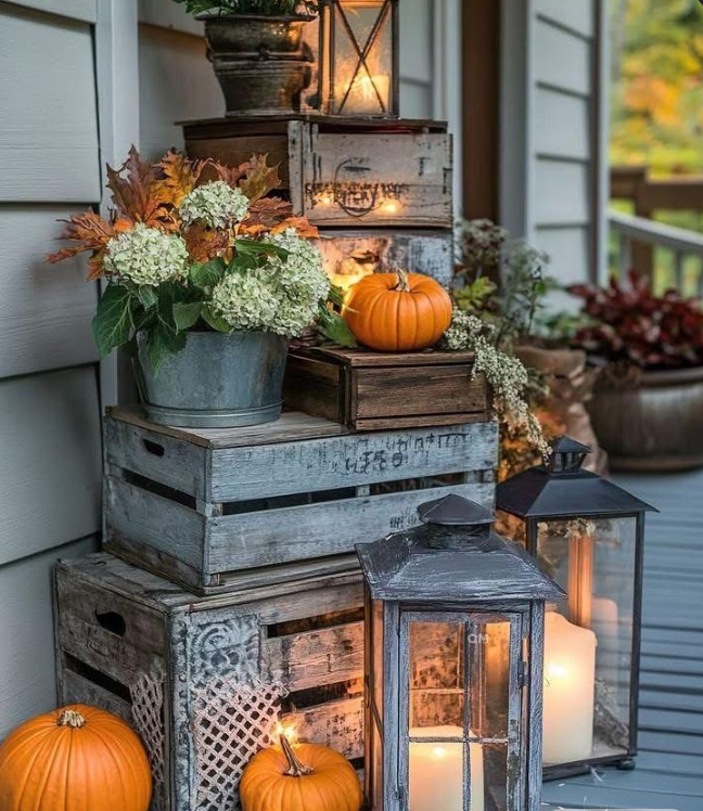Oh, how I love a good vintage crate. I got my first one at a flea market for five bucks and never looked back. They’re perfect for creating height and layers in your fall porch decor. I stack them, lean them, fill them with mums or pumpkins—whatever I’ve got that week, honestly.