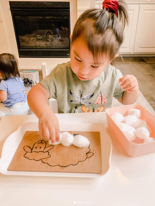 Non-toxic paints, glue sticks, safety scissors, paper plates, cardboard, and cotton balls are safe and easy to handle.