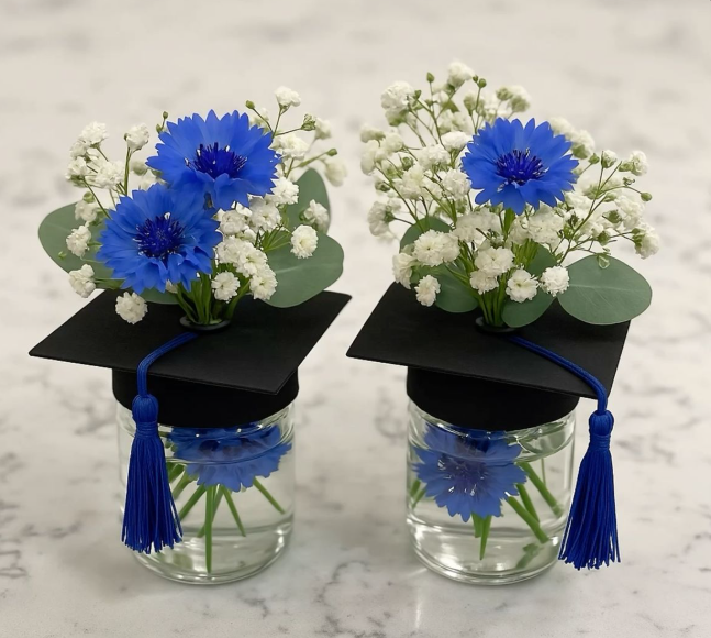 You can use fresh or artificial flowers—both work. I usually suggest choosing flowers in school colors to keep the theme strong. Then add something unexpected: mini photos, charms, or even small graduation caps tucked inside. To be fair, it doesn’t need to be Pinterest-perfect. Slightly messy arrangements often feel warmer and more natural.