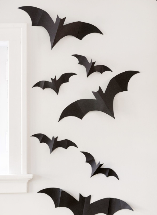 A simple and festive way to decorate walls or doorways. Cut out multiple bat shapes and string them together into a garland. You can use glitter, googly eyes, or glow-in-the-dark paint to enhance the spookiness. Great for party backdrops!