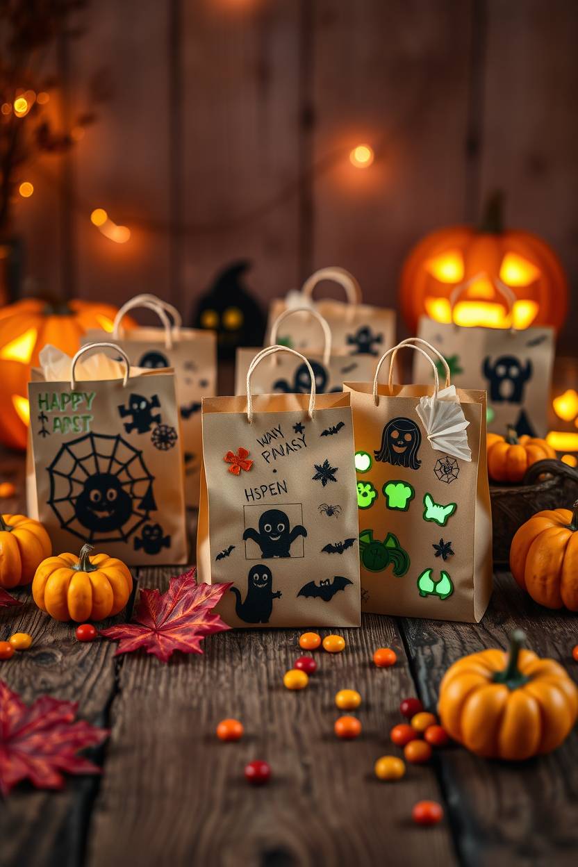 Easy crafts include hand-painted pumpkins, paper garlands, treat bags, glow-in-the-dark decorations, and simple felt monsters.