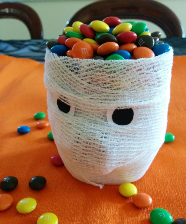 Every Halloween, I love setting up a candy station, and Mummy Candy Jars make it look extra special. Just wrap white gauze or tape around a jar, add eyes, and fill it with candies. I use clear jars so the colorful candies peek through the bandages—it’s a nice contrast.