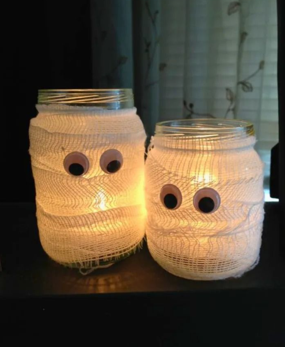 I made these once when I was short on time, and wow, they turned out surprisingly fun. You can basically take any glass candle holder (even an old drinking glass), wrap it with white crepe paper or gauze, and stick on a couple of googly eyes. I used double-sided tape instead of glue—way less messy, to be fair. When you light the candle inside, it gives off this eerie flicker that looks like the mummy is alive!