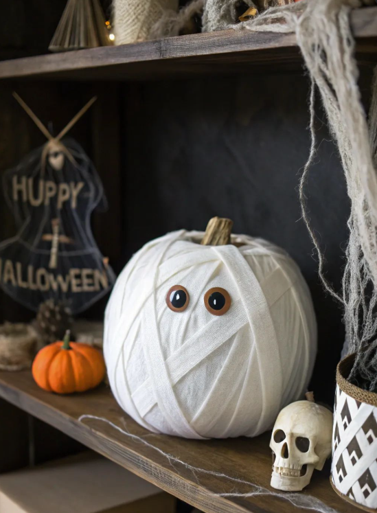 So, you know how everyone carves pumpkins for Halloween? Well, I’m terrible at carving. Like, truly terrible. So I started wrapping my pumpkins instead! Mummy Pumpkins are my lazy-but-creative solution. I just grab some white gauze or strips of fabric, wrap them around a mini pumpkin, and stick on a pair of goofy eyes.