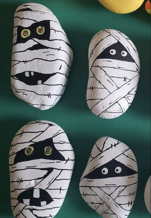 This one is kind of nostalgic for me. I did it with my nephew when he was five, and we ended up making a whole “mummy family” of painted rocks. All you need are smooth rocks, white paint, and a black marker. Paint the rocks white, draw a few “bandage” lines, and glue on small eyes.