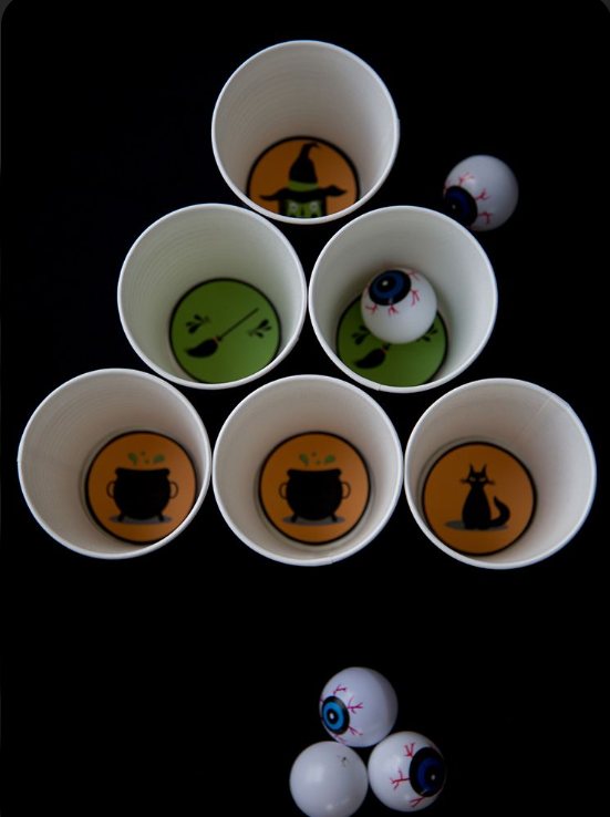 Players take turns trying to toss the “eyeballs” into opponents’ cups.