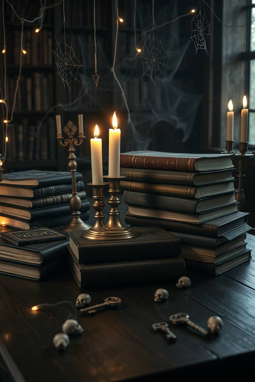 I’ve always been obsessed with haunted mansions, so recreating that vibe on my table was a blast. Think old, dusty books stacked unevenly, some vintage-looking candle holders, and a few cobwebs thrown on top. I even found some old keys and tiny skull trinkets to scatter around. It felt like a mini spooky library!