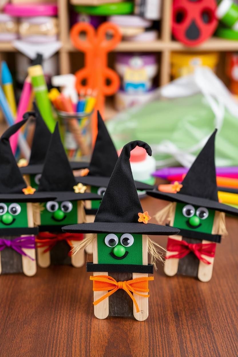 This one brings out the builder in every kid. You line up three or four popsicle sticks side by side for the body, glue a triangle hat on top, and then paint and decorate like mad. We’ve had witches with pom-pom earrings, fuzzy pipe cleaner arms, and even mini brooms taped to the back.