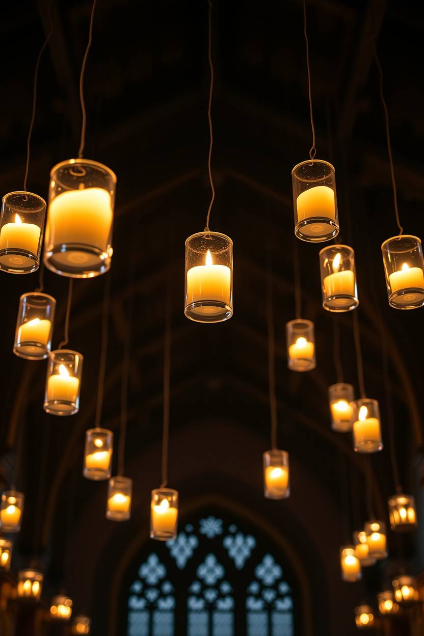 Use lightweight battery-operated LED candles hung from clear fishing line or string. Avoid real candles to prevent fire hazards.