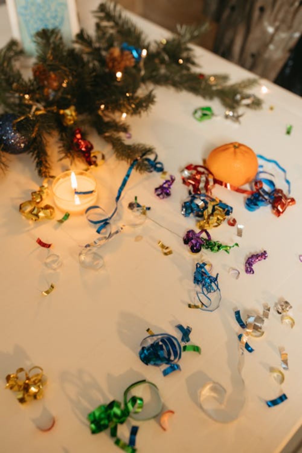 Okay, confession: I once spent hours cutting tiny bits of shiny paper to make my own confetti because I refused to buy overpriced ones. Totally worth it! Scatter them across your dining or snack table, and then add a few candles or glass bowls filled with sequins — it looks fabulous in pictures. I’ve found that clear jars or bowls filled with gold and silver confetti make the perfect centerpiece. You can even hide tiny LED lights inside them for a glowing effect. Just be prepared to find bits of confetti everywhere the next morning — in your hair, your socks, probably your snacks too. But hey, that’s the fun of it, right?