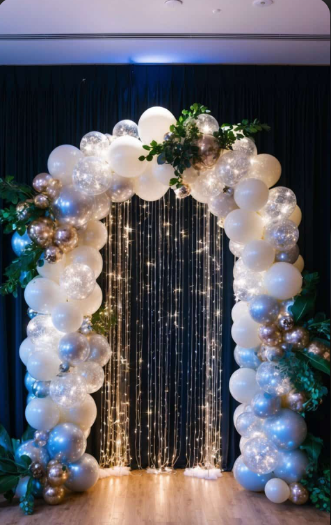 I’ve always believed balloons instantly make any party feel festive, and metallic ones? Even better. Last year, I created a gold and silver balloon arch right near my window, and it became the perfect selfie spot for everyone. You can either buy a balloon arch kit or freestyle it — trust me, even if it’s a little uneven, no one notices once the lights dim and the laughter starts. What I love most is how reflective metallic balloons are; they catch the light and make the whole room shimmer. My tip? Mix in a few black or transparent balloons with confetti inside for contrast. It looks more expensive than it actually is. And honestly, when guests walk in and see that shiny arch, they always go “Whoa!” — totally worth the little effort.