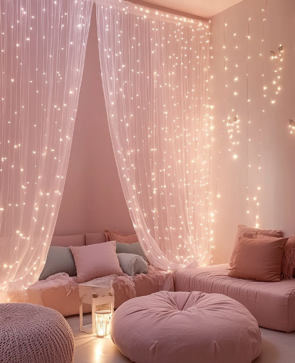 In my opinion, pink fairy lights are a game-changer. I draped them across the mantel, around windows, and even hung some from the ceiling last year. Honestly, it instantly makes the room feel magical and cozy. I like to mix in a few twinkly white lights to break up the pink so it doesn’t feel overwhelming.