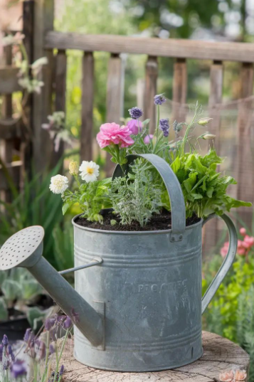 The trick is to choose flowers that spill slightly over the edges, like petunias or small daisies. It creates that relaxed, cottage-style look that works perfectly for spring. I usually place these watering can planters on my porch steps or garden table. To be fair, you don’t even have to plant flowers directly in them — sometimes I just place a small flower pot inside the can. In my opinion, this little decor idea adds a lot of personality to outdoor spaces.