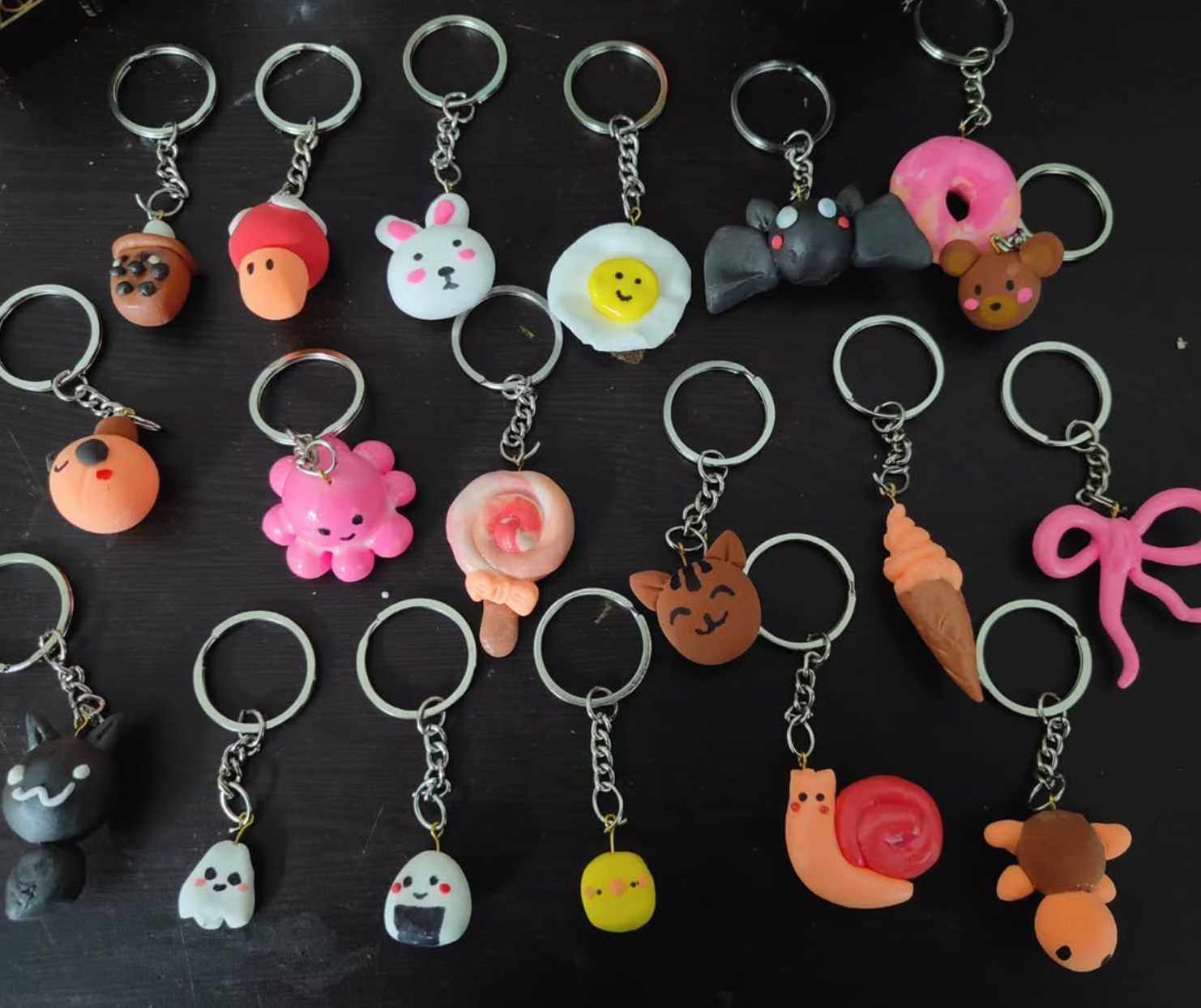 Materials Used: Air-dry clay, small cutter, keychain rings, paint, glaze.
