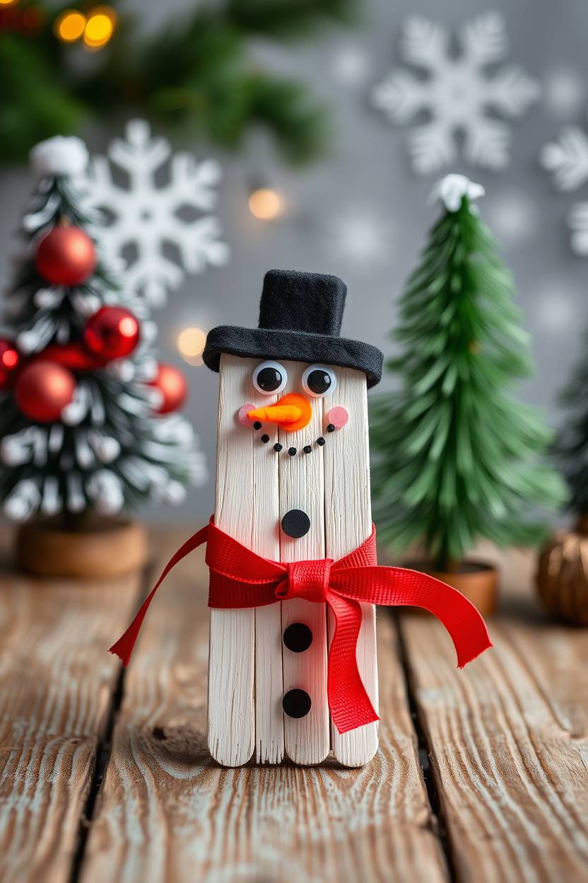 Ah, popsicle stick snowmen. I remember doing this craft with a group of energetic first graders and somehow ending up with glitter on my eyebrows. You line up 5–6 sticks side by side, glue another two horizontally behind to hold them together, and boom—your snowman’s body is ready. I paint mine white first, then add a strip of black paint or felt for the hat.