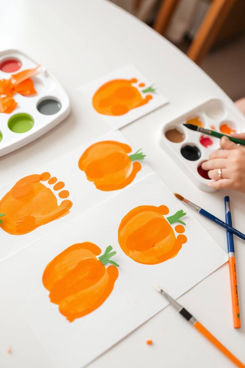 Footprint pumpkin painting is honestly hilarious. I still laugh thinking about my baby’s tiny toes making a pumpkin shape on paper. I usually use orange paint for the foot and green for a little stem. The key is pressing lightly so it doesn’t squish too much.