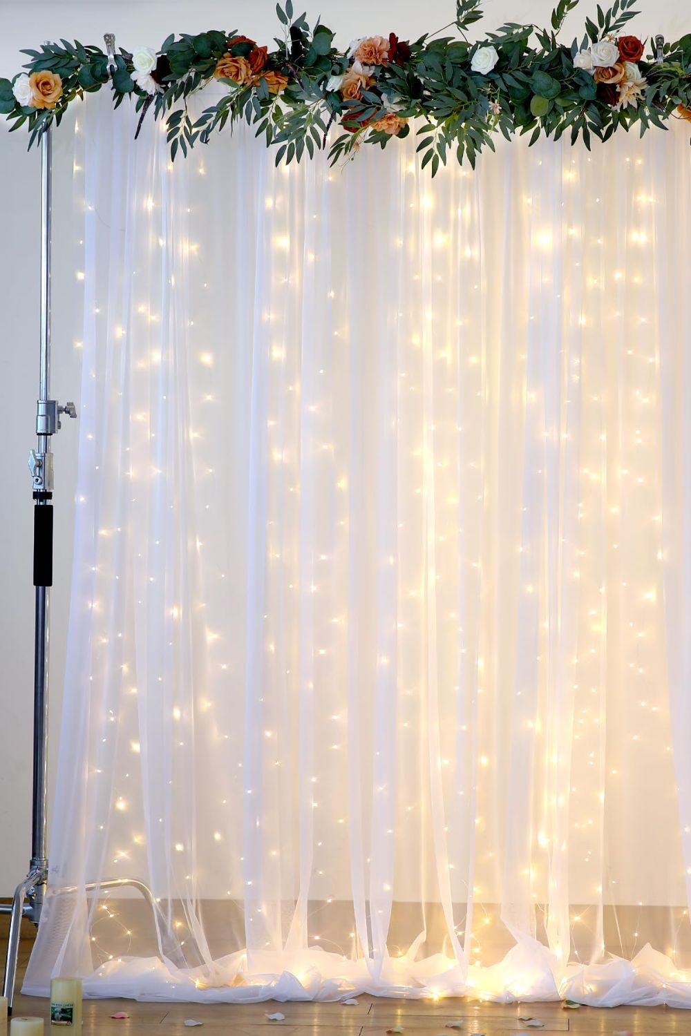 I usually suggest layering the lights over a sheer curtain or neutral fabric. It softens everything and adds depth. Honestly, even a plain wall looks stunning once the lights are on. If you dim the main lights slightly, this backdrop does all the work for you.